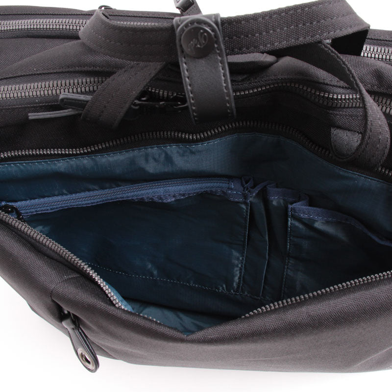 前面ポケット内装はオーガナイザー機能を持たせ携帯電話やペン、
